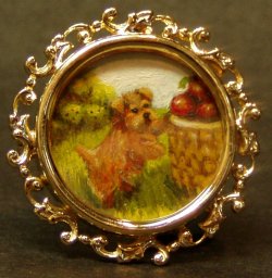 gold pin with miniature oil painting set under watch crystal. 1inch round