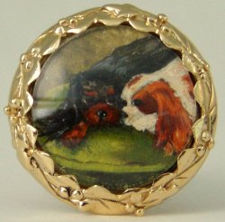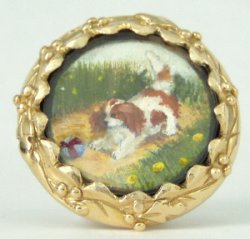 pin with miniature oil paintings set under watch crystal. 1 inch round